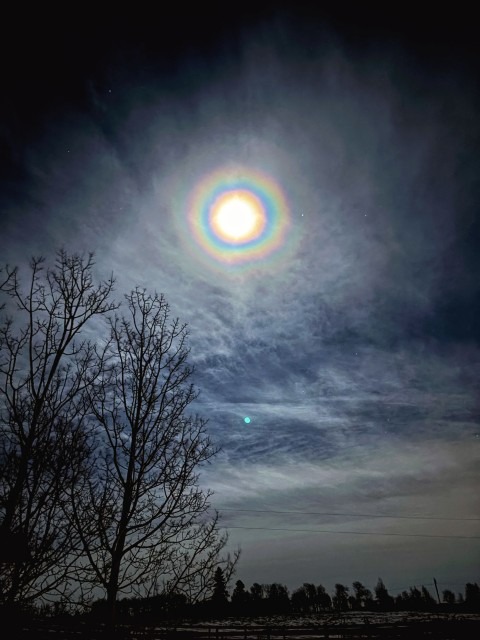 Here is a meteorological phenomenon that is often misnamed “halo.” A corona is similar to a halo in that they both form rings around the Sun and Moon. The Sun’s corona (the one formed in Earth’s atmosphere, not the one around the actual Sun) is hard to see because the Sun is so bright. A corona is a more subtle effect and needs the more muted light of the Moon to really show itself.
