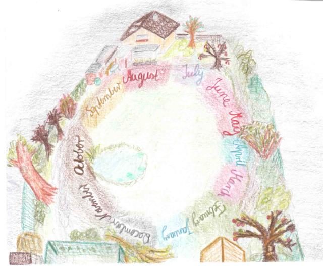 For as long as I can remember my year has been egg-shaped, with the pointy end centered on the last week in December and the broad end comprising the summer, particularly July and August. I know that makes the oval asymmetrical, with the spring side being longer than the autumn side, but that’s my egg. Depending on where I am looking in the year, I might see the months stretching out ahead and curving to the right, or behind and curving to the left. The winter end is darker and the summer lighter. The spring side is greener and bluer, while autumn is yellower and redder. There are many more details that show themselves under closer looking, and everything looks different depending on where on the year I am. I did not know that this was a form of synesthesia. If I had thought about it, I would have assumed that it was the same for everyone. Neither of these images looks like my year.