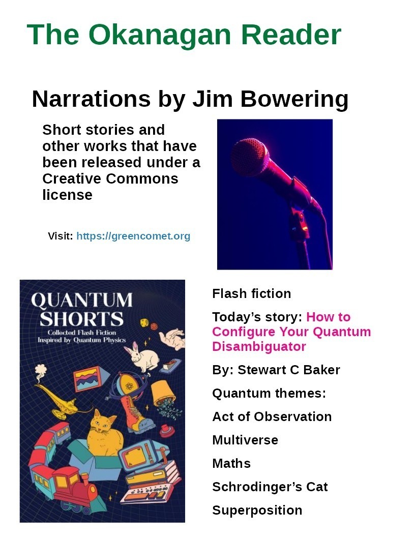 Another Quantum Shorts reading uploaded to YouTube. This one is taking an exceptionally long time to get through the copyright check on upload. In fact, it’s still checking as I post this. The story is published with a Creative Commons license, as is the recording. I made the recording myself and I’m uploading it to my own channel. But somehow Google’s AI is having a problem checking the copyright. Maybe it finds the phrase “Quantum Disambiguator” ambiguous. At any rate, I’m not too worried about the impending AI revolt. It’s obviously not very bright.-)