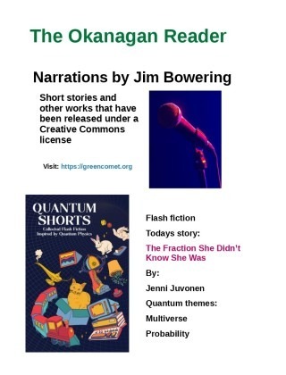 This reading is The Fraction She Didn’t Know She Was by Jenni Juvonen, from the collection Quantum Shorts. Its quantum themes are the multiverse and probability. Imagine the many ways a person could react when someone wants to break up with them. What if they all happen?